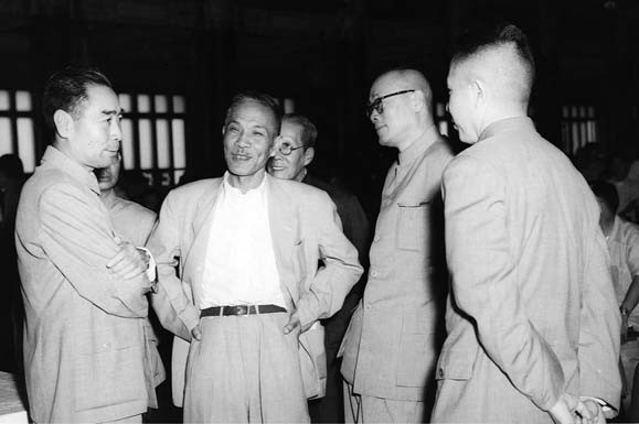 周恩来总理(左1)在学部成立大会上与哲学社会科学部学部委员翦伯赞、范文澜、周扬(前排左2起)等交谈。